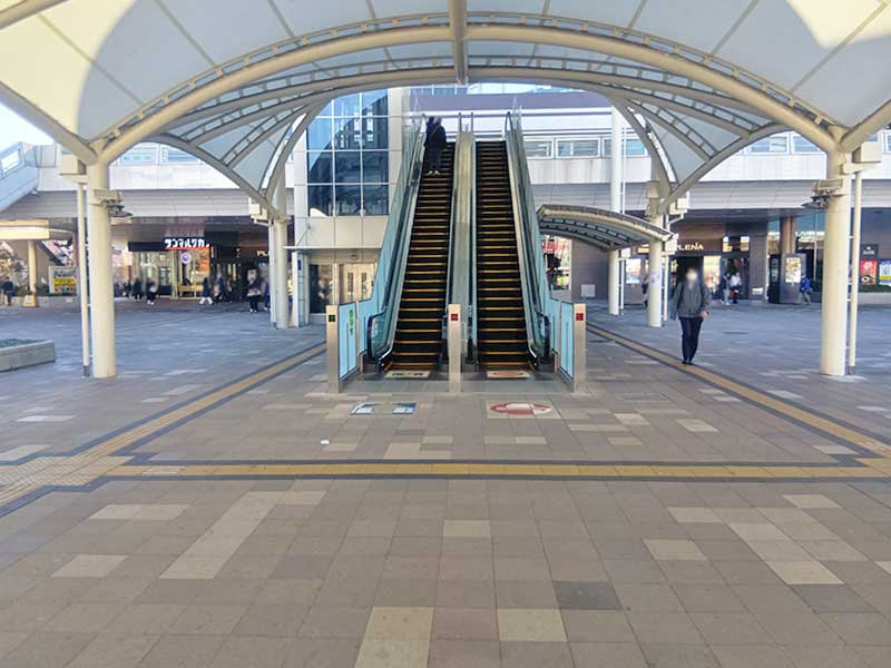 南口から出てそのまままっすぐ進み、前方にあるエスカレーターを上がります。
