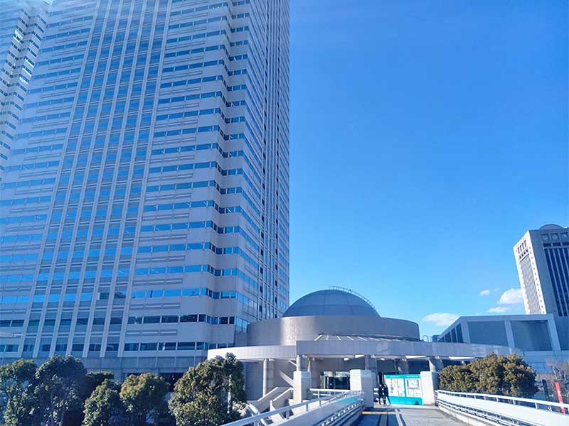 歩道橋を進んでいくと、左前方に高層ビルが見えます。